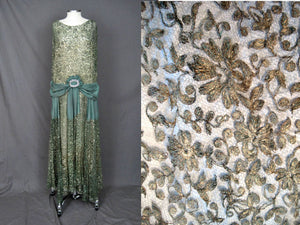 1920s Silk Net Lace Gown Gold Metal Embroidery Jade Green Silk Lame