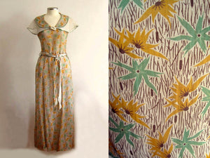 1930s Green Mustard Floral Print Cotton Voile Day Dress Excellent