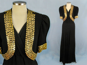 1930s Studded Black Rayon Crepe Dress Bolero Old Hollywood Gown