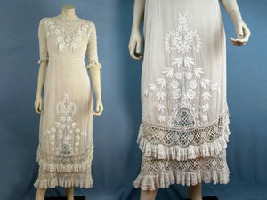 1910s Edwardian Tea Dress Fine Lawn Fabric Schifli Lace Apron Overlay