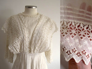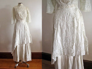 1900s Edwardian Wedding Dress Cotton Tea Gown Broderie Anglais Whitework